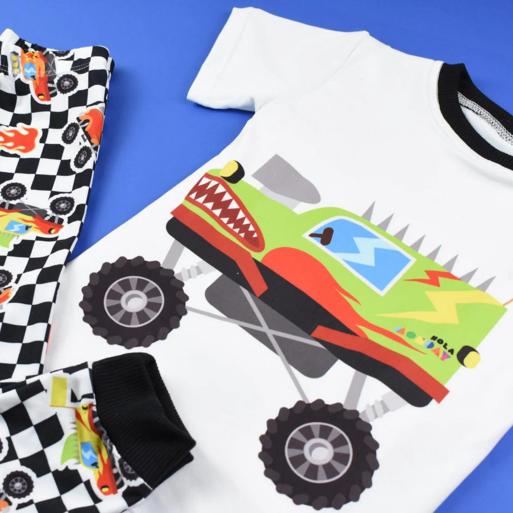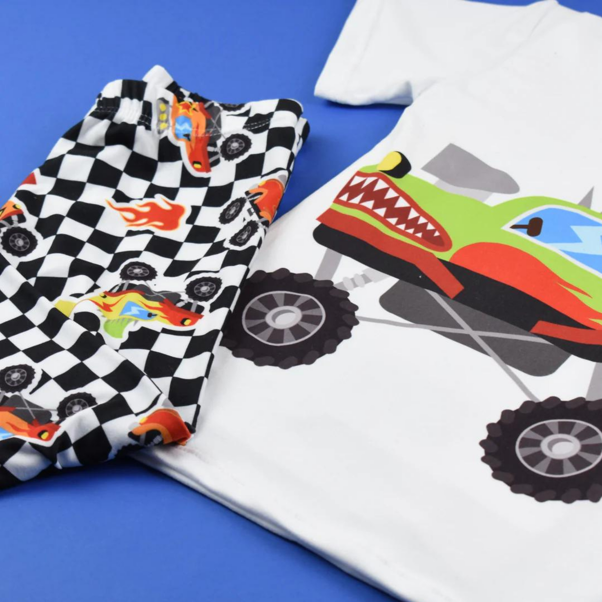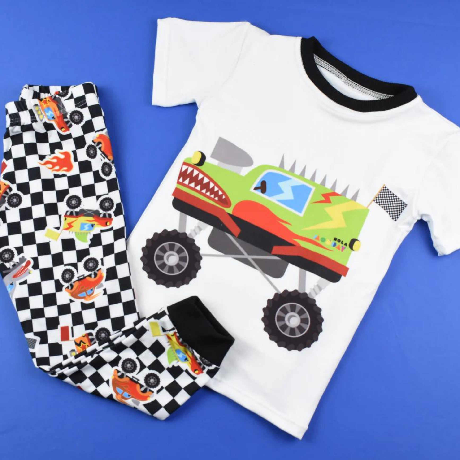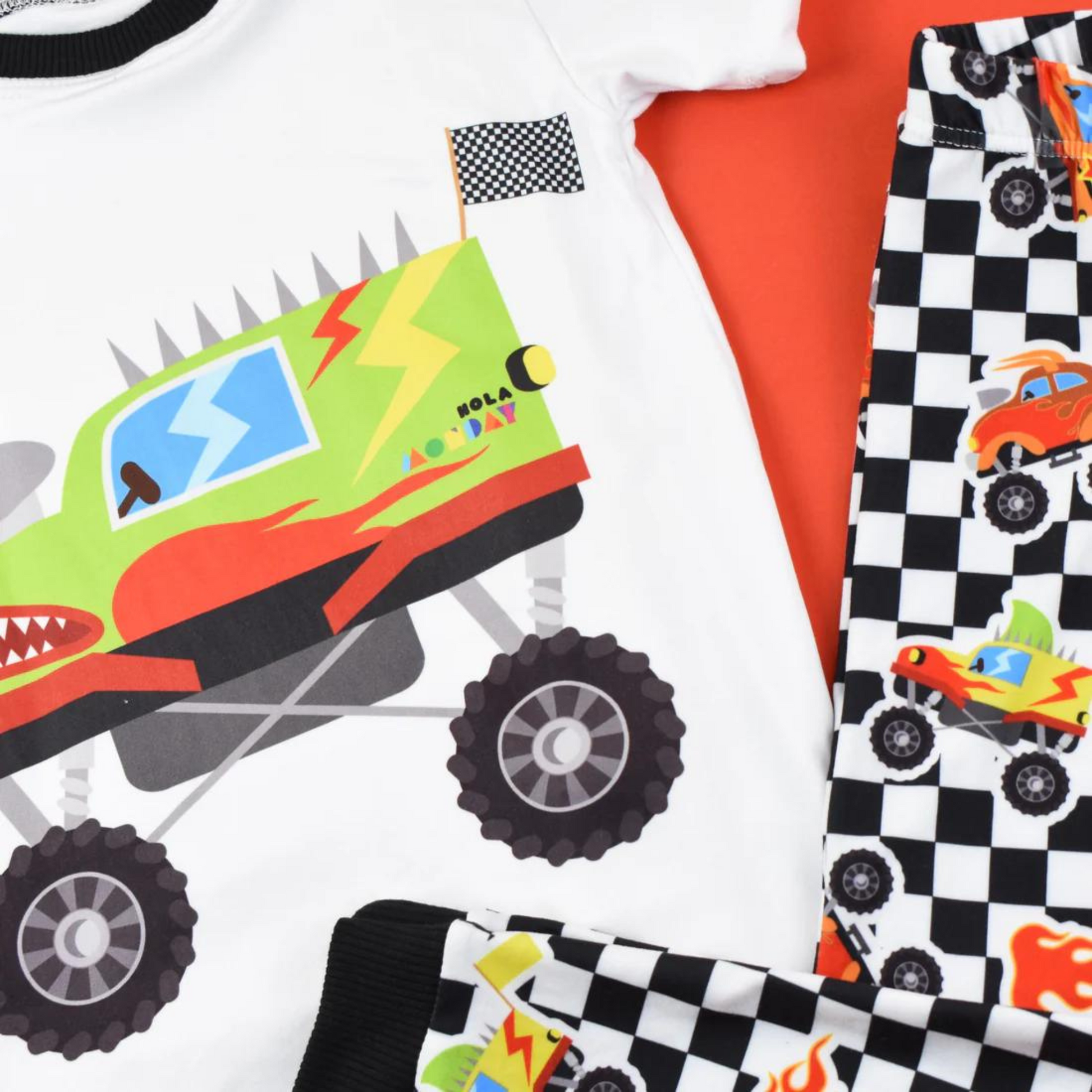 Get ready to rev up bedtime fun with the Monster Truck Rally Pajama! This set features an action-packed monster truck on the top, complete with flames, spikes, and lightning bolts—everything your little racer needs for a thrilling bedtime adventure. The matching checkered pants are loaded with even more monster trucks, roaring across a racecourse of black-and-white flags. Made from super soft, breathable fabric, this pajama set ensures your child stays comfy while dreaming of high-flying stunts and winning big at the monster truck rally.